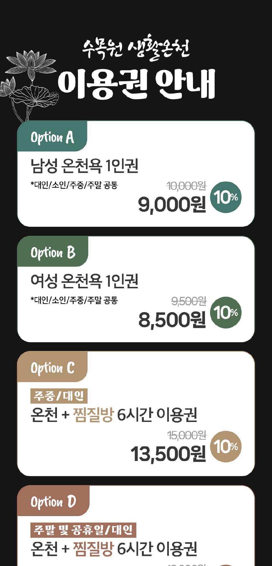 * 찜질방은 10월 25일부터 이용 가능하며 9:00~21:30 까지 이용 가능합니다.(온천+찜질방 이용 시 6시간 기준입니다.)