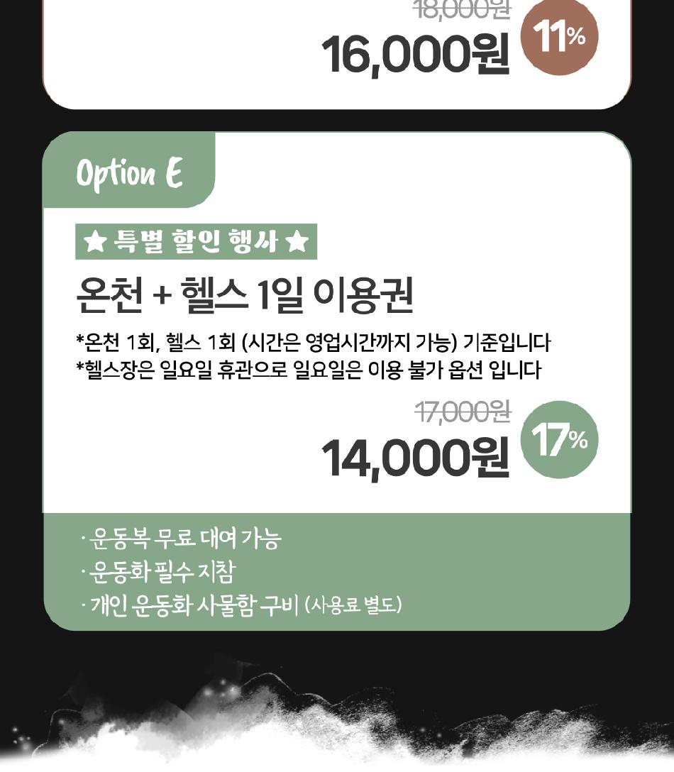 * 생활온천 두부방, 휘트니스, PT룸 등 추가시설은 현장결제로 이용 가능합니다.
