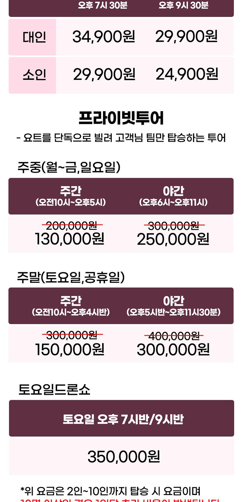 * 프라이빗 투어는 기본 최대 10명까지 이용가능 하며, 인원 초과시 추가비용이 있습니다.