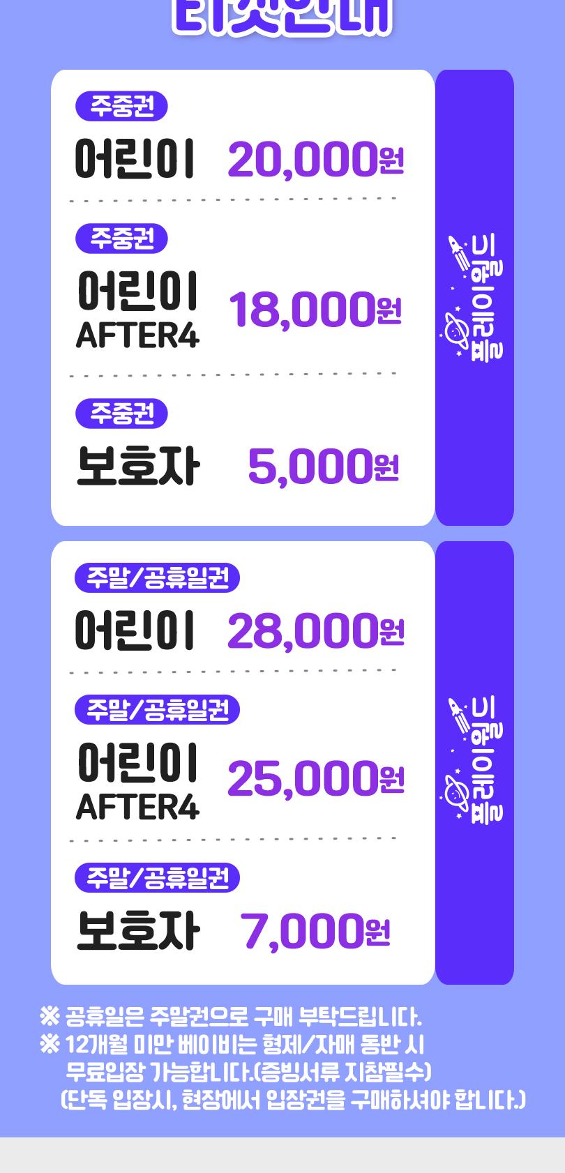 * ※ 주중 어린이AFTER4 티켓은 오후 4시부터 입장가능하며, 최대 수용인원 초과시 대기 발생할 수 있습니다.