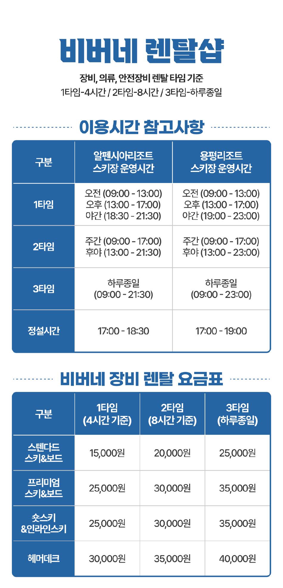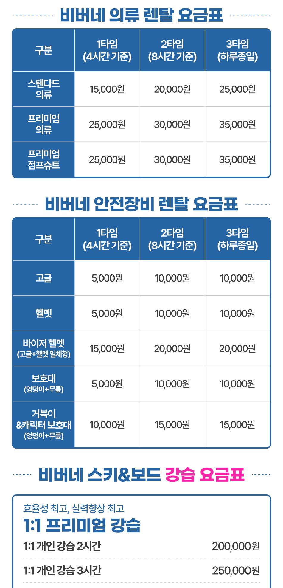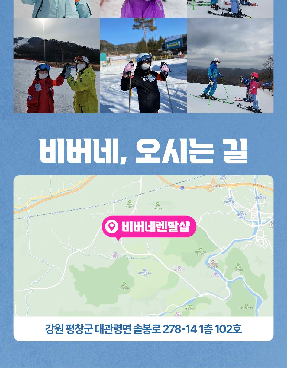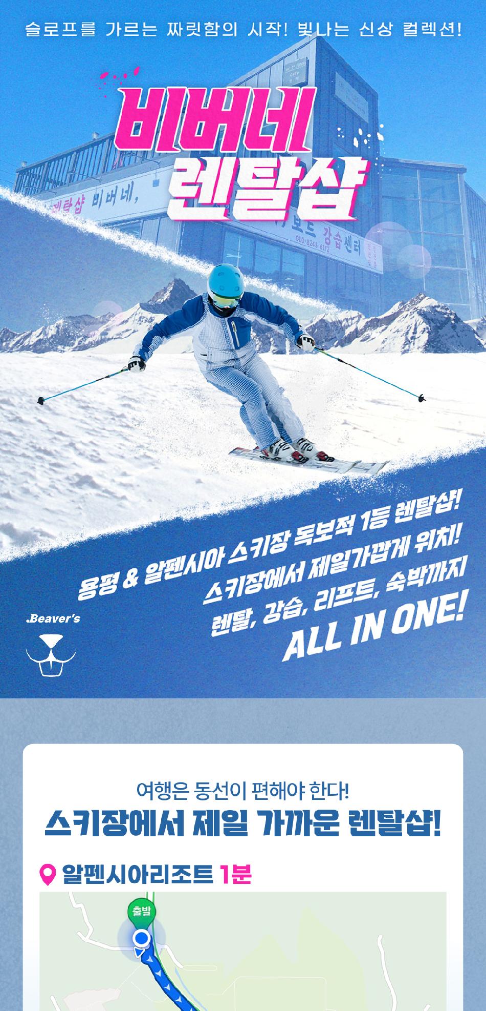 - 스키장 도착→비버네렌탈샵으로 이동→렌탈+리프트권등 모든 준비완료→전부 챙겨서 스키장으로 다시 이동→신나게 즐기고 난 후→비버네렌탈샵으로 전화→비버네렌탈샵 차량에 전부 반납→귀가 또는 숙박♥