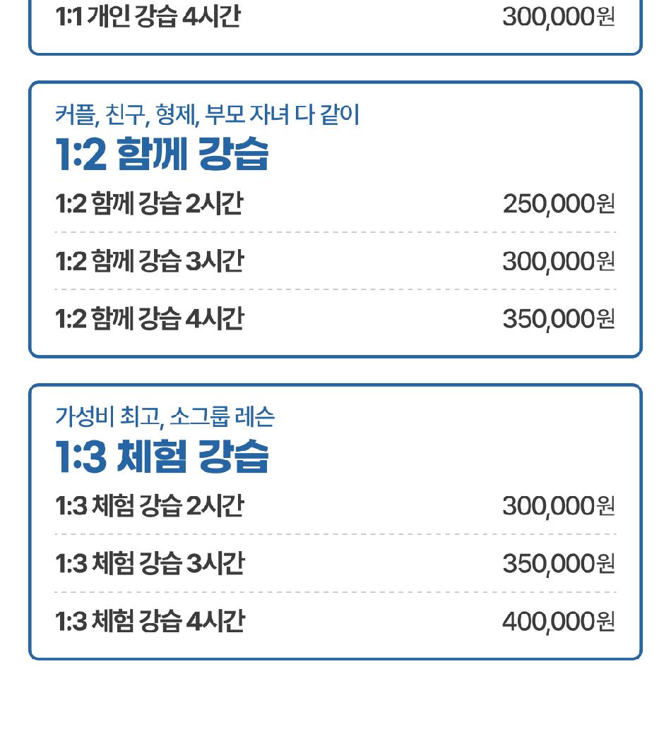 - 원하시는 날짜와 시간대를 추천드리며 실력, 경험 유/무, 연령등 충분한 상담 후 맞춤 강사배정으로 보다 재미있고 안전하게 강습을 받아보세요!
