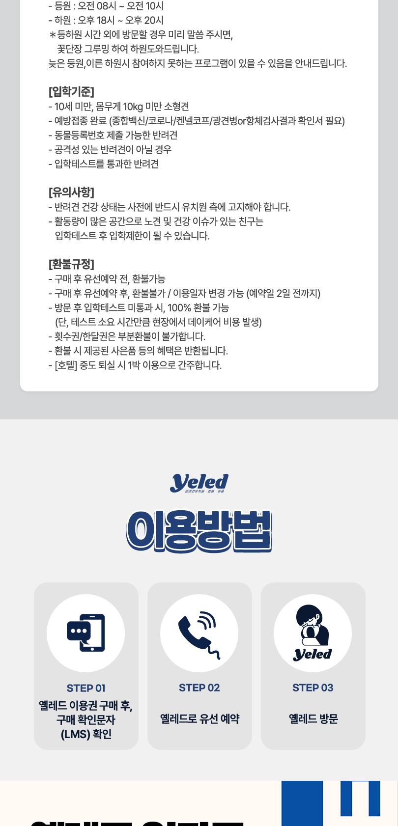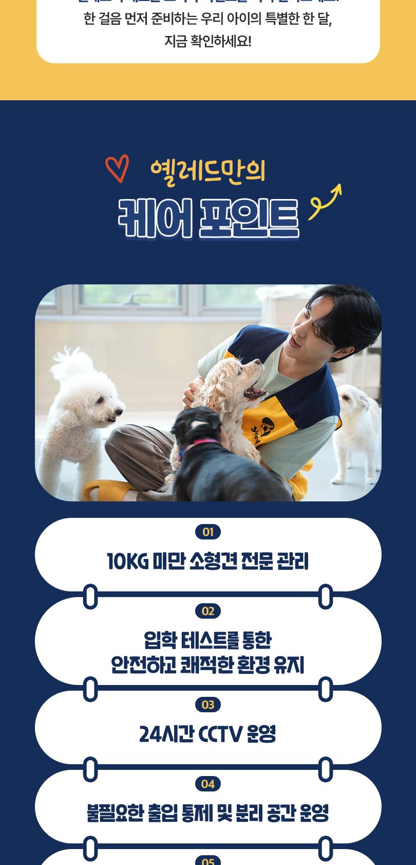 * 활동량이 많은 공간으로 노견 및 건강 이슈가 있는 친구는 입학테스트 후 입학제한이 될 수 있습니다.
