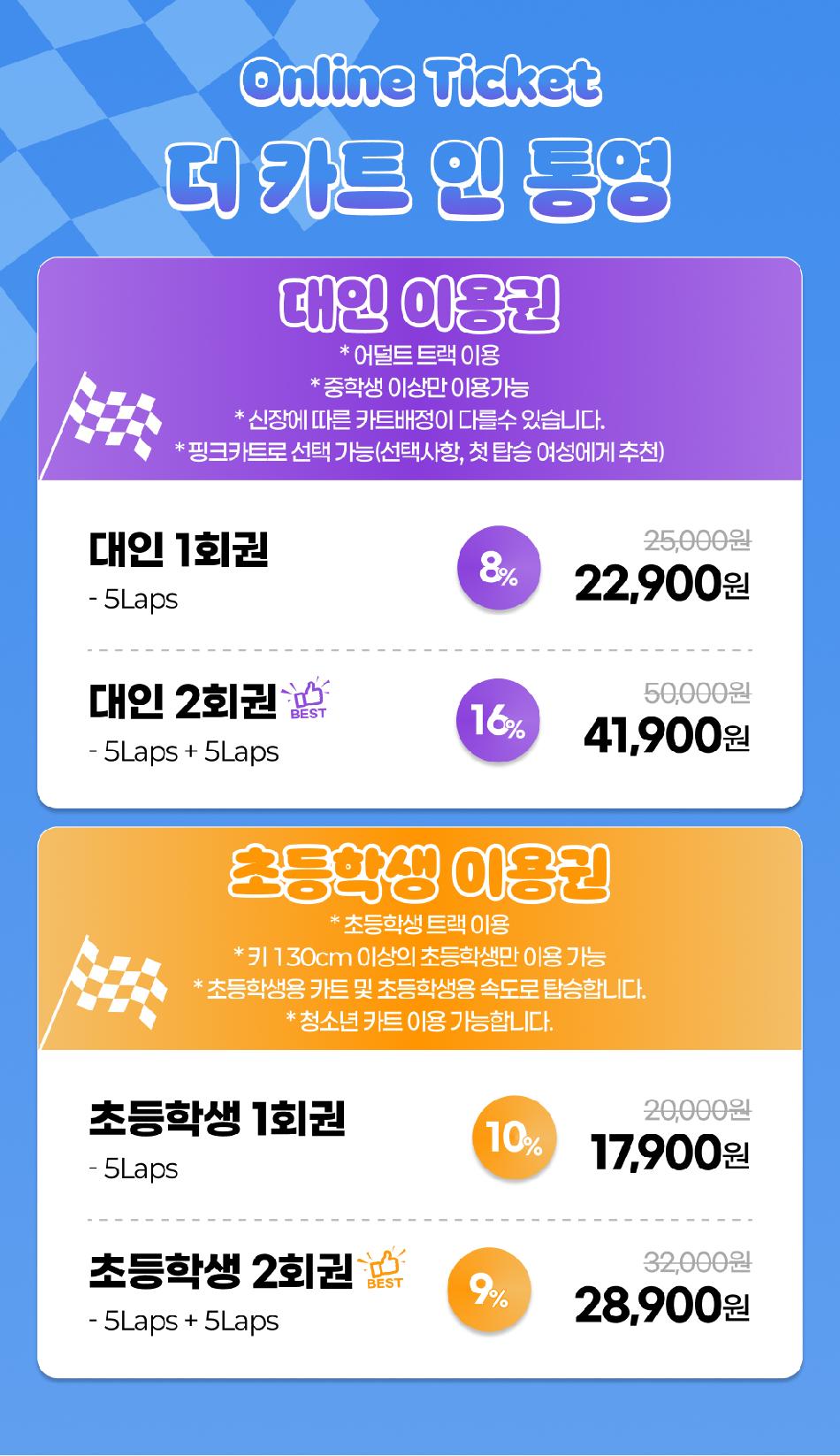 * 4) 초등생 카트는 130cm 이상만 이용이 가능합니다(14세 이상 이용이 가능하나, 초등학생 카트, 초등학생 서킷, 초등학생 속도로 탑승 가능)