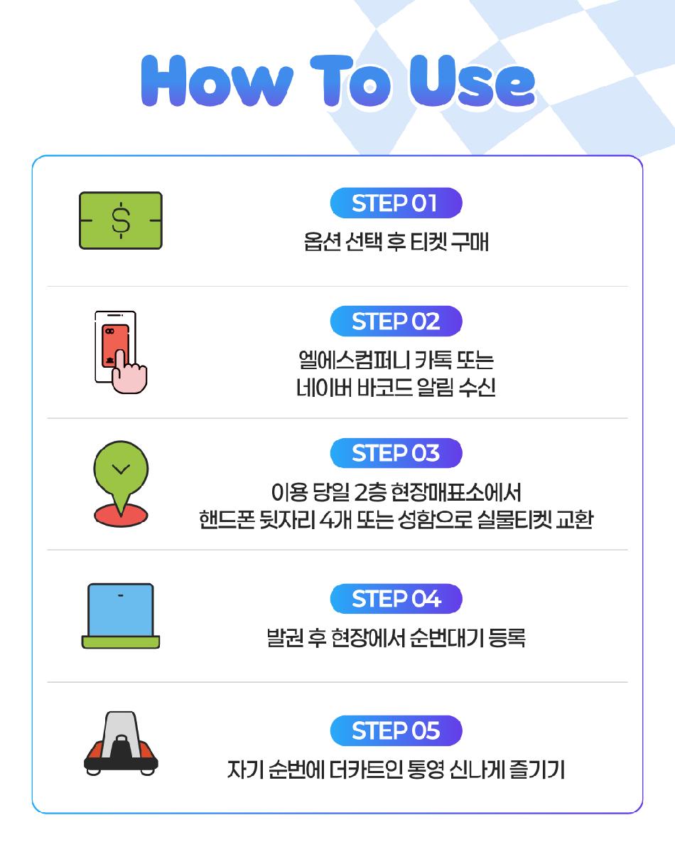 * 2) 이용 당일 2층 현장매표소에서 성함/연락처 확인 후 실물티켓 교환 > 발권 후 현장 순번대기 등록 > 본인 순번에 더카트인 통영 신나게 즐기기