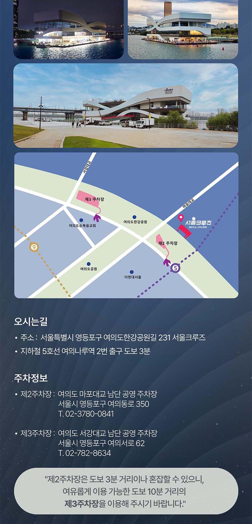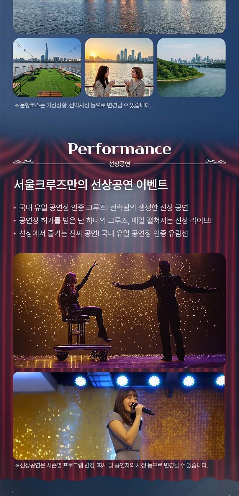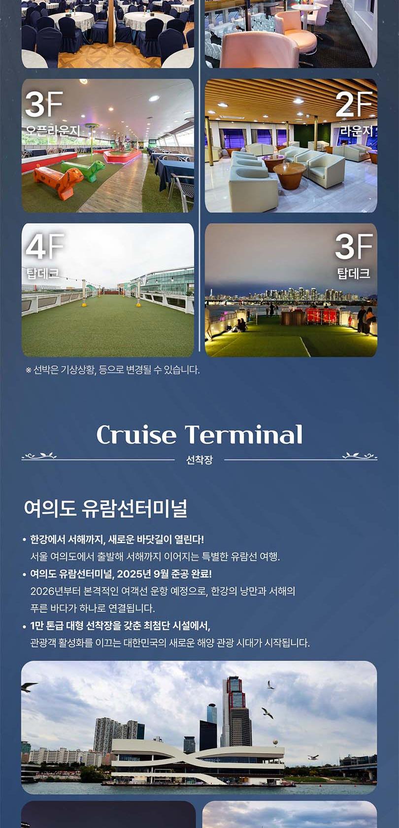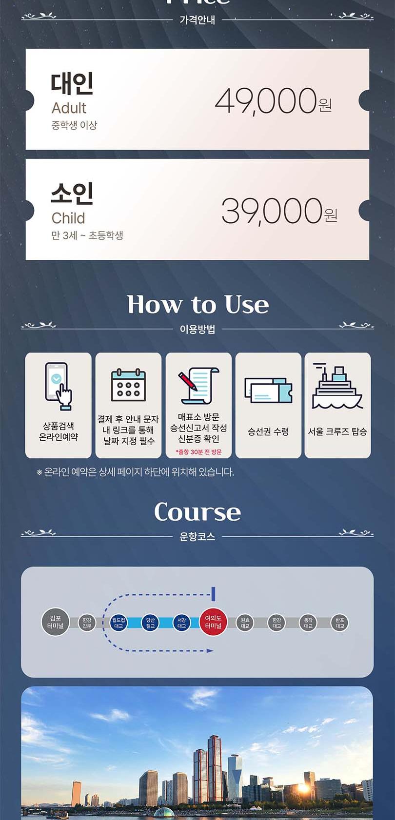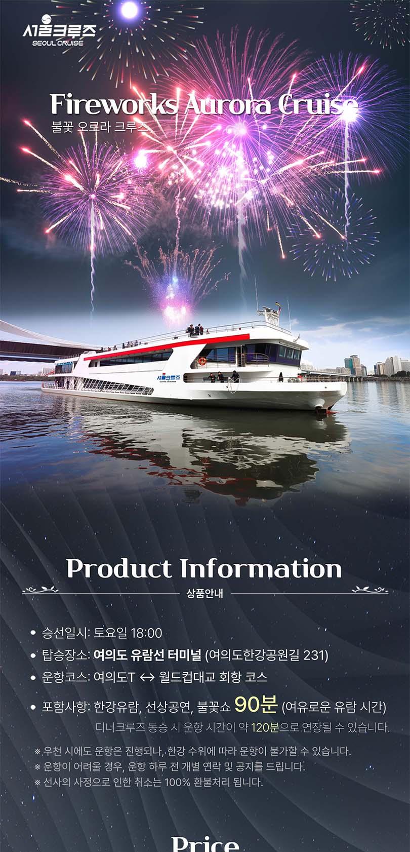 *한강방류, 기상악화, 선박사정 등으로 한강 운항이 불가능할 경우 아라뱃길 코스로 진행되며, 이로 인한 환불 및 요금 인하는 없습니다.