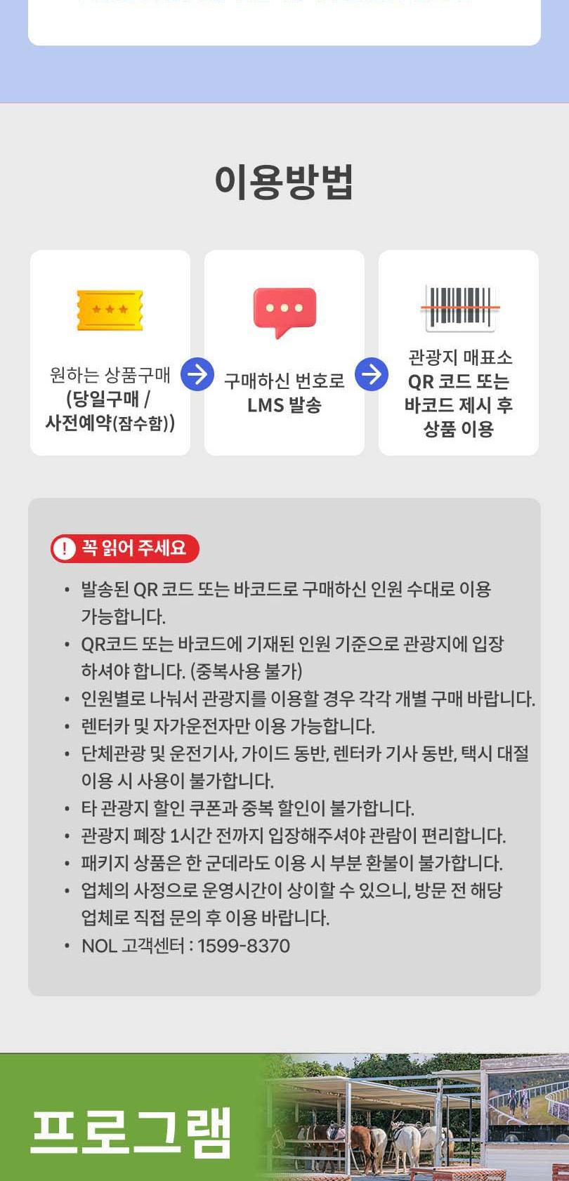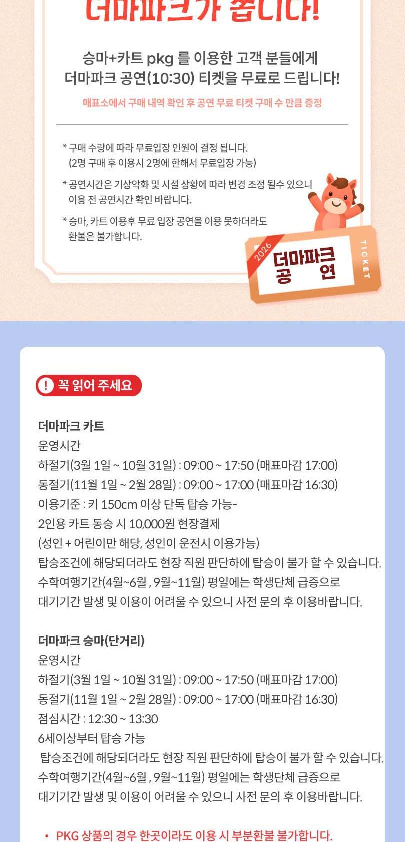 * 승마, 카트 이용후 무료 입장 공연을 이용 못하더라도 환불은 불가합니다.